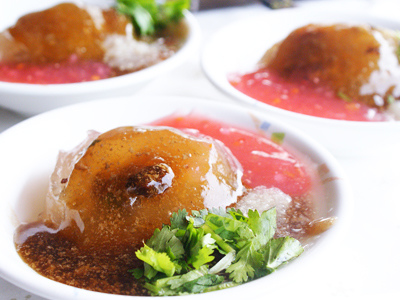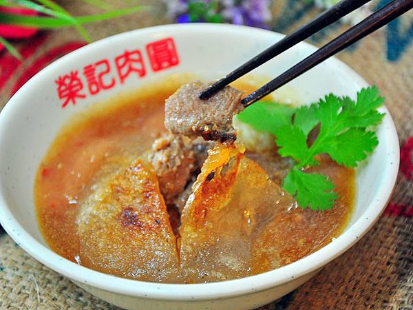 榮記煎の肉圓外皮採用本土地瓜粉,因而顯得晶瑩剔透、Q而不黏,內餡則是上好呷心肉調以古法配方滷製,接以地瓜粉漿包饀之後,先蒸熟再煎至外皮Q脆且不油膩,淋上榮記古早味調味醬汁,美味至極,令人讚不絶口!