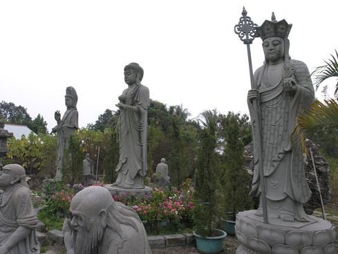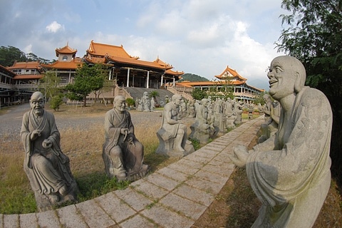 在群山的環繞下,背山面水的諦願寺顯得幽靜沉潛,悠然超塵。而廟外廣場有五百尊羅漢,是由青斗石雕刻而成,每尊羅漢的動作、面貌及神情都不同,看起來栩栩如生。